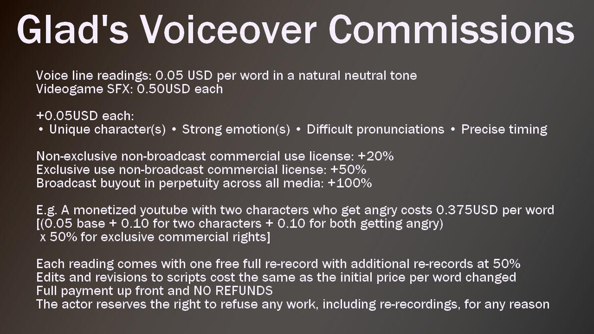 I do voiceovers, audio mixing, and microphone setup consultations. Reach me by email or Discord DM at Glad Lad#8008
